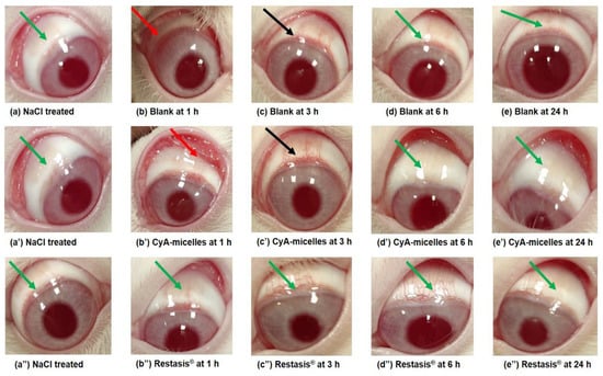 No significant signs or symptoms of discomfort were found during the irritation testing in the treated animals with blank micelles (unloaded), CyA-loaded micelles, and Restasis®. Figure 10a,a′,a″ represent images of NaCl treated (right) eyes of rabbits of the respective group (green arrows). Figure 10b,b′ represent the mild redness (red arrows) of the conjunctiva and abnormal discharge at 1 h post instillation of blank micelles and CyA-Micelles, respectively. This abnormal discharge might be due to the surfactant property of the di-block copolymer and physiological secretion, which is in agreement with our previous report [21]. No redness or inflammation was observed in the Restasis® treated eyes even at the initial hour (1 h) of the experiment as shown in Figure 10b″ (green arrow). In fact, in the present investigation, the Restasis® treated animals did not show any signs and symptoms of ocular irritation at any time points as represented in Figure 10c″,d″,e″ (green arrow). The redness of conjunctiva was decreased at 3 h post instillation of CyA-Micelles (Figure 10c′) (black arrow) and at 6 h it disappeared (Figure 10d′) (green arrow) and the eyes were recovered their normal conditions at 24 h (Figure 10e″) (green arrow). Redness of conjunctiva was also decreased at 3 h in the blank micelles treated eye (Figure 10c) (black arrow), it disappeared at 6 h (Figure 10d) (green arrow) and the eyes regained their normal condition at 24 h (Figure 10e) (green arrow), that might be due to the natural defensive mechanism of the animal and lower irritation potential of the unloaded Myrj S100-b-PCL88 polymeric micelles.