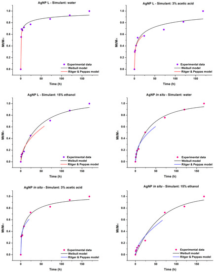 The Weibull model has two parameters, a (defines the time scale of the process) and b (refers to the shape of the curve). According to this model, the value of b also makes reference to the release mechanism. Papadopoulou et al. [36] reported that b values between 0.35 and 0.75 correspond to release by diffusion, while if they are in the range of 0.75 to 1, the release mechanism will be a combination of swelling and relaxation of the polymer chains. Finally, if b > 1, it is possible that a complex mechanism governs the release of the active component from the material to the simulant medium. When this model was applied to study the mechanism of Ag release, the sample containing AgNP L in the aqueous medium could not be adjusted because the b parameter was lower than 0.35 (b = 0.22, Table 2). However, with respect to the 3% v/v acetic acid medium, the model predicted a diffusive release mechanism that agrees with what was previously found by the Ritger and Peppas model. For the 15% v/v ethanol simulant, the fit by the Weibull model showed a swelling and relaxation of the polymer chains mechanism, which can be compared to that observed by applying Equation (3) for short contact times.