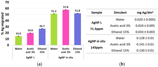 Ag migration percentage (a) and Ag content released (b) after 7 days of sample immersion in the simulants tested: water, 3% v/v acetic acid and 15% v/v ethanol.