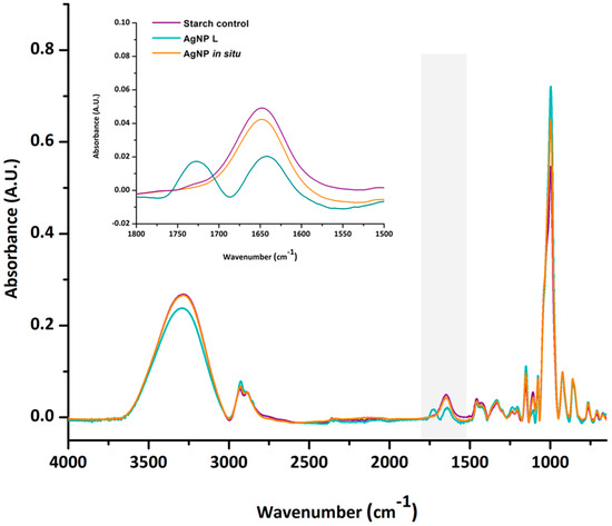 This hypothesis was confirmed through ATR-FTIR spectroscopic analysis. Figure 4 shows the ATR-FTIR spectra of the samples; no great differences were observed in terms of the absorption bands present in the control and nanocomposite films (AgNP in situ and AgNP L), except for that located at 1729 cm−1, which is only present in the films with AgNP L. This peak corresponds to the vibrations of the C-O bonds of the carboxyl and ester carbonyl groups, confirming the formation of the ester bond due to the crosslinking of the starch matrix by citric acid. Similar results were informed by Reddy and Yang [44] and Shi et al. [45]. Likewise, the incorporation of AgNP L leads to a decrease in the band at 3290 cm−1 attributed to O-H vibration (Figure 4), indicating that these groups are involved in the formation of the ester bond.