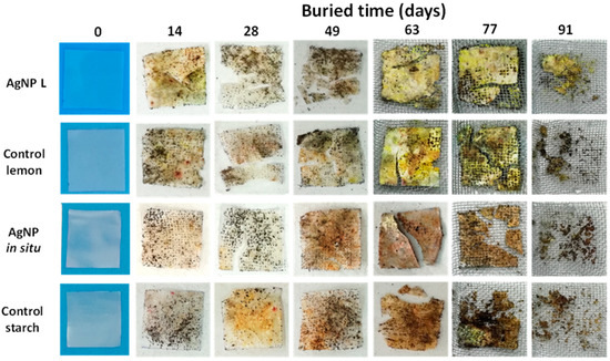 The visual appearance of the control samples (control starch and control lemon), and the nanocomposite starch films obtained with AgNP in situ and with the incorporation of 71.5 ppm of AgNP L, after remaining buried for a certain time is shown in Figure 5. As mentioned previously, all the films were initially flexible, colorless and transparent [18,19,20]. Soil contains many types of microorganisms that bring about physical changes which are important indicators of biodegradation. In addition, the visual changes observed (film opacity increase, Figure 4) are also an indicator of microbial action facilitated by the film moisture uptake from the surrounding soil [50,51]. After incubation in soil at 20 °C for 14 days, cracks were observed in both films with AgNP L and the corresponding control. In addition, it was possible to perceive color and opacity changes, which suggests that the process of the disintegration of the materials by the fungi and microorganisms present in the soil began [51]. Likewise, after 28 days of storage, the bio-disintegration of the control starch films and those with AgNP in situ was visible, since water absorption of the films facilitates the microbial attack, causing cracks in the materials. In addition, it was observed that the disintegration of the samples containing extracts of lemon juice required less time compared to the other samples, because the organic compounds present in the lemon would be a richer source of nutrients for microorganisms of the soil and therefore facilitate the degradation of the material. Similar results were reported by Luchese et al. [23] when working with cassava starch films containing orange residues, and by Medina-Jaramillo et al. [52], who added yerba mate extracts to cassava starch films.