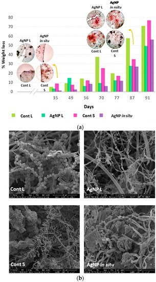 Weight loss percentage of the materials subjected to bio-disintegration: control and nanocomposite films with AgNP L and AgNP in situ (a). Control and nanocomposite film samples after 87 days of disintegration observed with the scanning electron microscope (b).