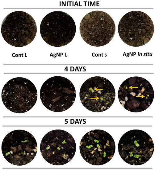 The germination of lettuce seeds, selected by their high growth rate, was carried out under environmental conditions and in all cases sprouts were observed. In the case of the compost derived from control materials and that in contact with films containing silver nanoparticles synthesized in situ, 4 days were required to detect the sprouts, while the rest of the samples germinated after 5 days (Figure 7). Thus, it can be inferred that the films’ biodegradation did not contribute compounds with phytotoxic activity to the compost under the evaluated conditions.