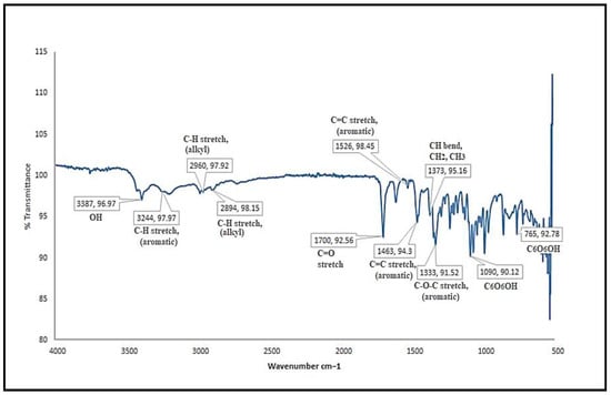 The FTIR (νmax cm−1) spectra of isolated bergenin (Figure 2) shows characteristic 3387 (O−H); 3244 (C−H stretching, aromatic); 2960, 2894 (C−H stretching, alkyl); 1700 (C=O stretching); 1609, 1526, 1463 (C=C stretching, aromatic); 1373 (CH bend, CH2, CH3); 1333 (C−O−C stretching, ether); 1090, 765 (C6H6OH). The isolated crystalline compound was confirmed as bergenin when the melting point, UV and FTIR spectra were compared with the data reported for standard bergenin.