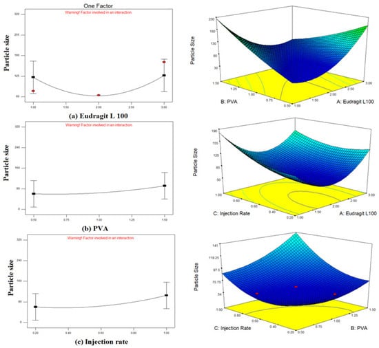 The entrapment efficiency of 15 formulations of bergenin nanoparticles ranges from 67.66 to 85.5%. The correlation between entrapment efficiency and independent variables was drawn after the selection of a suitable model based on a p-value of <0.05. The 2FI was selected having a p-value of 0.0322. Three-dimensional surface graphs explaining the impact of polymers, surfactants and injection rates on entrapment efficiency are depicted in Figure 4.