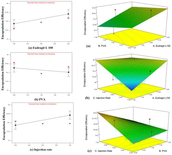 Graphical representation of the impact of independent variables on encapsulation efficiency of bergenin-loaded nanoparticles. (a) EL 100 (b) PVA (c) organic phase injection rate and 3-D response surface plot (a) PVA and EL 100 (b) organic phase injection rate and EL 100 (c) organic phase injection rate and PVA.