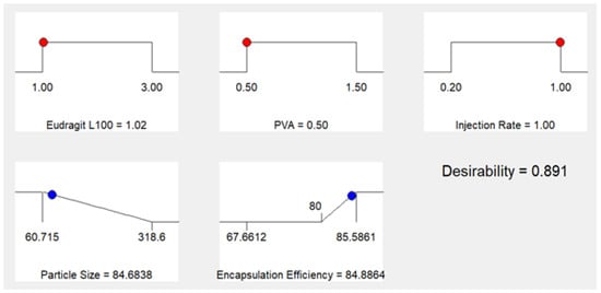 Optimized formulation was developed after the evaluation of 15 formulations in terms of their mean particle size and entrapment efficiency. Optimized formulation was developed using 50 mg or 1.02% (w/v) EL 100, 0.5% (w/v) PVA and an injection rate of 1 mL/min as suggested by the software having desirability of 0.891, i.e., having 89.1% chance of producing the required results, predicted by the software as shown in Figure 5.