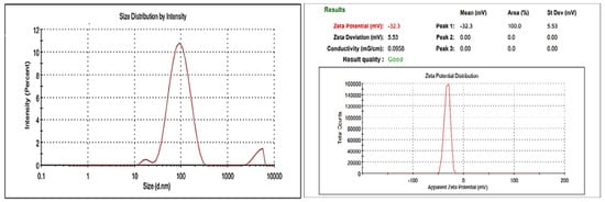 The smallest particle size of the optimized formulation is desirable with minimum PDI to keep the formulations stable. The particle size and PDI of optimized bergenin-loaded NPs are presented in Figure 6. Readings were taken in a triplicate manner and expressed as (n = 3, mean ± SD). The mean particle size for optimized nanoformulation was observed to be 86.17 ± 2.1 nm with a PDI of 0.30 ± 0.03. Zeta potential is a parameter that measures the surface charge of the formulation and is the measure of the stability of the nanodispersions. Absolute high potential values (±30 mV) are preferable in most cases in order to create a high energy barrier between the particles preventing their coalescence. The zeta potential value of the optimized nanoformulation was −32.33 ± 5.53 and is presented in Figure 6.