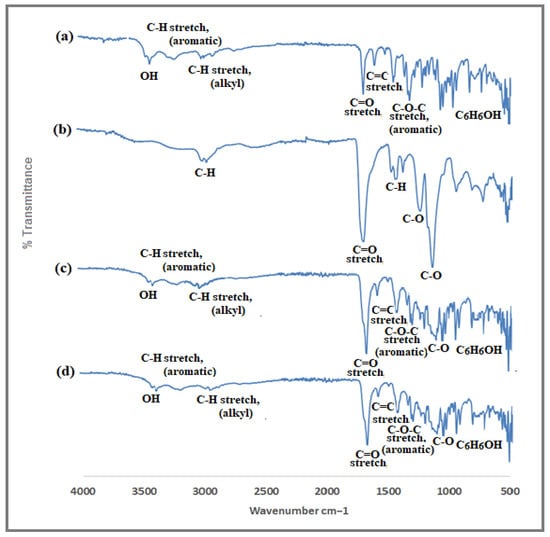 FTIR spectroscopy was performed using an FTIR spectrometer (Perkin-Elmer, spectrum 65, Waltham, MA, USA) to investigate any potential interaction between the drug and excipients. Bergenin, EL 100, the physical mixture (BN + EL 100) and the final formulation were analyzed through pellets preparation by mixing them separately with KBr in a ratio of 1:100 through the application of lb. pressure. Pellets after being placed in the sample holder were scanned at a wavelength range of 4000–400 cm–1.