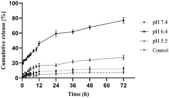 In vitro release profile of pH-sensitive nanoformulation at pH 7.4, 6.4, 5.5.