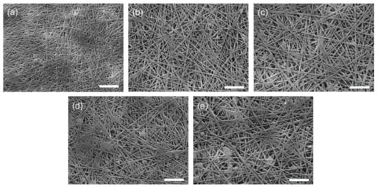 Surface SEM images of the PAN/ADEP composite membranes after sputter coating with platinum under a vacuum for 2 min: (a) PAN; (b) PAN/AD5; (c) PAN/AD10; (d) PAN/AD15; (e) PAN/AD20. The scale bars represent 10 μm.