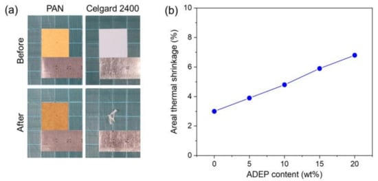 (a) Digital photographs of the PAN and Celgard 2400 membranes before and after thermal exposure in air at 200 °C for 1 h; (b) the areal thermal shrinkages of the PAN membranes as a function of the content of ADEP.