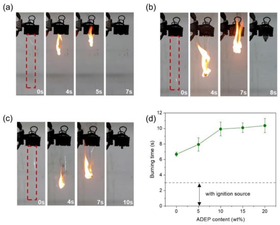 Digital photographs of the vertical burning test for (a) the pristine PAN film and the composite films containing (b) 5 wt% and (c) 10 wt% ADEP. The films were ignited for 3 s and (d) the burning time as a function of the content of ADEP was recorded.