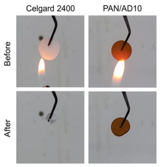Additionally, the flame retardancy of the membrane as a separator was examined using a circular specimen with a diameter of 18 mm after immersion in LE for 1 h. Figure 4 shows the burning test for Celgard 2400 and PAN/AD10 before and after exposure to the flame. When the flame was closed, Celgard 2400 shank extensively and immediately melted, while the circular shape of PAN/AD10 was maintained without significant deformations, identifying its good nonflammability. From these results, it was confirmed that the heat-resistant and flame-retardant PAN/AD10 membrane is a promising candidate for enhancing the safety of LIBs.