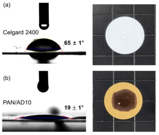 Images of the contact angle and wettability between the membrane and LE: (a) Celgard 2400 and (b) PAN/AD10.