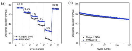 Comparison of (a) the discharge C-rate capabilities and (b) cycle performances (1.0 C-rate) between Celgard 2400 and PAN/AD10 (Li/membrane with LE/NCM622 cells, 3.0−4.2 V, room temperature).