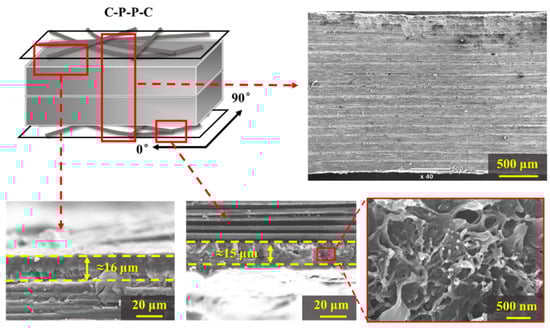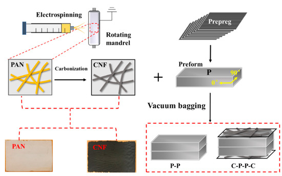First, the prepreg was stacked with a layup sequence to form a preform, which is composed of 8 layers of 0.125 mm-thick 0° prepreg. The preform was named P in this work. Second, two different samples (i.e., P-P and C-P-P-C) were prepared according to the layups illustrated in Figure 1. Here, a CNF sheet was labeled C. Finally, the composites were prepared by a vacuum bag molding process. The preforms were heated to 130 °C at a rate of 5 °C/min and held for 1 h with a vacuum pressure of 0.098 MPa in an oven. Afterwards, the temperature was heated to 180 °C at the same heating rate and held for 2 h. The temperature was then raised to 200 °C for post-curing for 6 hours. Finally, the composites were removed from the vacuum bag after the mold was cooled to room temperature.