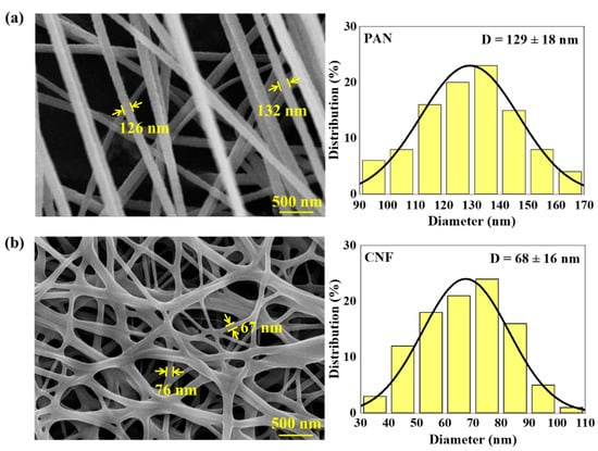 Figure 2 shows the representative SEM micrographs of PAN nanofibers and CNFs. The smooth and straight PAN nanofibers were attained with an average diameter of 129 ± 18 nm. After carbonization, unevenly distributed CNFs with thinner diameters (68 ± 16 nm) were obtained. In addition, as shown in Figure 2a, random PAN nanofibers were toughed together. During carbonization, a series of complex reactions, such as cyclization, pyrolysis and condensation, occurred, leading to the rearrangement of the molecular structures [19]. As a result, the areas where the PAN nanofibers were tough tended to merge together, forming a continuous two-dimensional network (Figure 2b), which is beneficial to the improvement of electrical conductivity.