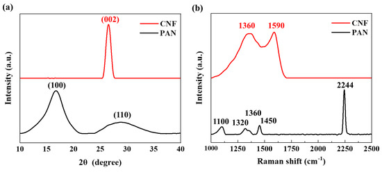 (a) XRD spectra and (b) Raman curves of PAN nanofibers and CNFs.