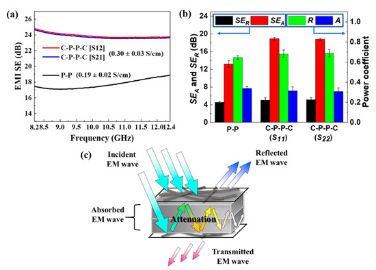 where T is the power coefficient of transmission, and S21 and S12 are the forward and reverse transmission parameters, respectively. The EMI SE in the X band and electrical conductivities of P-P and C-P-P-C are presented in Figure 5a. The electrical conductivity and SE value demonstrated a strong correlation. The average SE values of P-P and C-P-P-C were 17.7 and 23.9 dB, respectively. The 35.0% improvement was mainly attributed to the incorporation of CNF sheets.