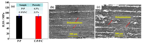 To assess the real applications of the composites, the ILSS, which is one of the crucial parameters for qualifying the mechanical properties of CFRCs, was tested. Figure 6a shows that the ILSSs of P-P and C-P-P-C were 88.3 and 87.0 MPa, respectively. The slight decrease might be attributed to the increase in porosity generated during the fabrication of C-P-P-C. The dominant failure mechanism of both P-P and C-P-P-C was interlaminar delamination, as shown in Figure 6b,c. These results indicated that the role of CNF sheets could be ignored in determining the mechanical properties of CFRCs.