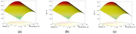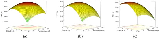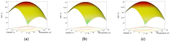 The response surfaces obtained from the model equations for xylan and total extraction yield in the case of corn stalks are shown in Figure 3 and Figure 4. The combined effects of temperature and CNaOH on the XEY and TEY after 60, 90, and 120 min are highlighted in 3D representations.