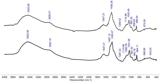 The bands in the FTIR spectra of the hemicellulose samples (Figure 5) were assigned as follows: the band occurring at ~3400 cm−1 was assigned to the stretching vibrations of the O-H groups; the band occurring at ~2950 cm−1 was assigned to the -CH2 antisymmetric stretching, while the band at 2850 cm−1 was a result of -CH2 symmetric stretching; the band occurring at ~1650 cm−1 was assigned to the absorbed water [81]. The strong band occurring at about 1450 cm−1 could be assigned to the presence of the methyl groups. Peaks are visible at ~1100 and ~1040 cm−1 of C-O stretching in the C-O-C ether linkages (the first is the inter sugar units and the second results from intra sugar (in alcoholic functional group). The peaks at ~895 cm−1 were attributed to the stretching vibration modes (both symmetric and antisymmetric) of C-O in the -C ether linkage. In fact, the 895 cm−1 peak is specific to the β-1-4 bonds between xylose units of the xylan chain [82]. Other bands at lower wavenumbers, such as ~690 cm−1, could be attributed to the out-of-plane C-H deformations.