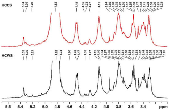 1H-NMR spectra of separated hemicelluloses. Black line, HCWS and red line, HCCS.