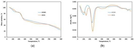 A thermogravimetric analysis is an important tool for studying the thermal stability of materials. The mass variation and the DTG curves obtained for the hemicellulose samples are displayed in Figure 7a,b. In general, the mechanism of the thermal decomposition of polymeric materials involves three main phases: water loss (drying), macromolecular chain degradations (depolymerization and pyrolysis), and finally char oxidation. The plots of the HCWS and HCCS samples are relatively similar, but some differences occur. In the case of the mass variation plot of HCWS, at least three main stages were observed: the first stage, between 52 °C and 125 °C, corresponds to complete dehydration (mass loss of 15.29%), the second stage corresponds to degradation, starting at 216 °C and ending up at 275 °C, with a mass loss of 28.9%; and the last stage, starting at about 360 °C and ending at 470 °C, is char oxidation. Peak temperature values (71 °C, 220 °C, and 420 °C) for the thermal decomposition of the HCWS are observable from the DTG curves (Figure 7b), which show the temperatures with the highest rates of reaction.
