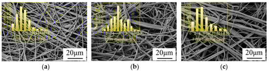 From Figure 5, it can be seen that the fiber diameter decreased as the hot air pressure increased. The reasons for this may be related to the fact that the increase in hot air speed and hot air pressure make the PLA/PBE blended melt receive more drawing force and are thus drawn more fully. Hence, the fiber diameter decreased, and the fiber diameter distribution was more concentrated.