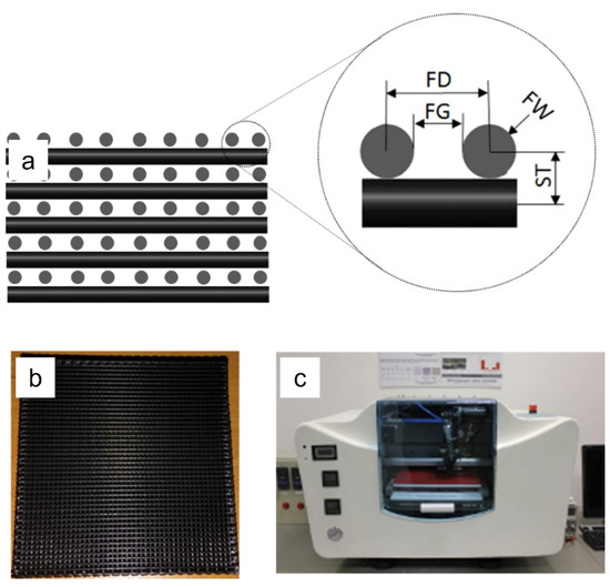 Scaffold design and fabrication; (a) cross-section of a 3D PCL/GPN design and its design parameters (FG, FD, FW, and ST); (b) 3D PCL/GPN scaffold, fabricated using the (c) Bioextruder® system (CDRSP homemade extrusion-based AM system).