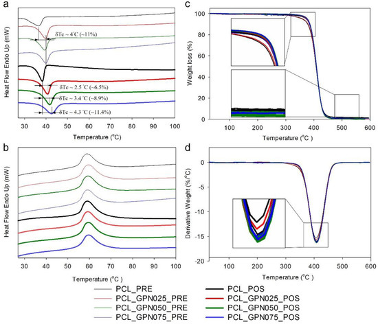 DSC (left column) and TGA (right column) results of the pre- and post-processed PCL/GPN composites: (a) DSC of first cooling cycle, (b) DSC of second heating cycle, (c) TGA curves, and (d) derivative of TGA curves.