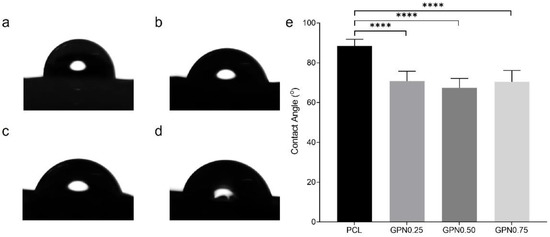 The water contact angle of PCL scaffolds was compared for all PCL/GPN groups (Figure 3). A water droplet with a contact angle of 88.41° was observed on the PCL scaffold’s surface. Regarding PCL/GPN composites, water contact angle was 70.80°, 67.42°, and 70.36° for GPN0.25, GPN0.50, and GPN0.75, respectively. The results revealed significant differences between PCL and PCL/GPN groups.