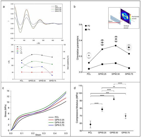 SAXS (upper line) and mechanical properties (bottom line): (a) Correlation function obtained from scattering curves (left), and variation in the values of long period (Lp), crystalline (Cb), and amorphous layer (Ab) thicknesses and bulk crystallinity (BC) extracted from correlation functions with GPN content (right); (b) 2D SAXS pattern and orientation parameters <P2> and <P4> of PCL filaments with different contents on GPN; (c) PCL and PCL/GPN scaffold stress–strain curves under compression; (d) compressive modulus of 3D PCL and PCL/GPN scaffolds. Statistical differences: ** p < 0.01; *** p < 0.001; **** p < 0.0001.