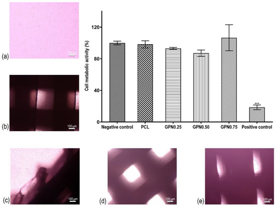 Biological in vitro testing of scaffolds: (b) PCL; (c) GPN0.25; (d) GPN0.50; (e) GPN0.75) with L929 cells; cytotoxicity assay according to ISO 10993-5 guidelines direct and indirect extract tests. The percentages of cell viability of the material extracts were normalized to the negative control (a) L929 fibroblasts in standard culture medium. The positive control used was latex for cytotoxic effects. Statistical differences: *** p < 0.001.