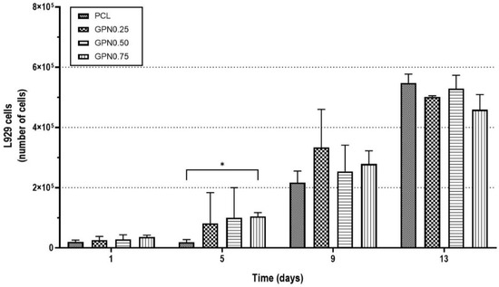Moreover, a 13-day experiment was performed to further study cell–biomaterial interactions, namely, the scaffold’s capacity to promote L929 fibroblasts proliferation (Figure 6). It was possible to observe that L929 fibroblasts presented low levels of cell adhesion to the scaffolds, but with a high proliferation capacity with fold increase of 28, 22, 23, and 13 (day 13 in relation to day 1) of PCL, GPN0.25, GPN0.5, and GPN0.75, respectively.
