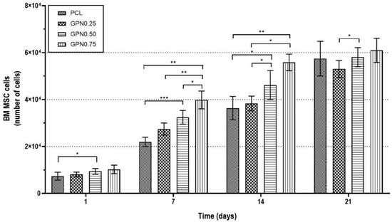 Although there are no significant statistical differences between PCL and PCL/GPN structures after three weeks (Figure 7), the results for 7 and 14 days show an increased number of cells with higher levels of GPN. We note that LIVE/DEAD staining revealed some level of cell death with the higher GPN content compared to the other conditions (Figure 8). Nevertheless, as can be observed for all scaffold groups in the DAPI/PHA staining and SEM analysis images (Figure 8), BM MSCs presented regular fibroblast-like spindle shape morphology and were able to migrate throughout the whole scaffold structure, even occupying its pores. These results together with the BM MSC proliferation capacity shown in Figure 7 suggest the suitability of 3D PCL/GPN scaffolds for tissue engineering applications.