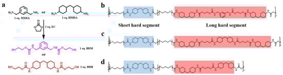 (a) Synthetic routes of BDM and BDH; (b) Molecular structure of BDM-1.7 elastomers embedded with short and long hard segments; (c) Molecular structure of BDH-1.7 elastomers embedded with short and long hard segments; (d) Molecular structure of EG-1.7 elastomers embedded with short and long hard segments.