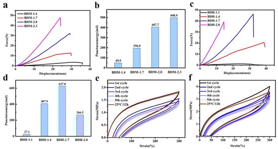 (a) Force-displacement curves for BDM-based elastomer; (b) Puncture energies of BDM-based elastomers calculated from force-displacement curves; (c) Force-displacement curves for BDH-based elastomer; (d) Puncture energies of BDH-based elastomers calculated from force-displacement curves; (e,f) Cyclic test curves of BDM-1.7, BDH-1.7 elastomer.
