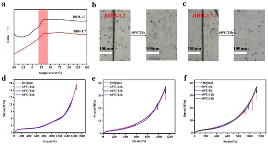According to the DSC results (Figure 4a), the Tg of hard segment of BDM-1.7 and BDH-1.7 elastomers were 30.4 and 29.8 °C, respectively. Theoretically, when the temperature was higher than the Tg temperature, these two kinds of elastomers were in high elastic state and had certain self-healing ability. Both DSC and variable-temperature FTIR results indicate that BDM-based and BDH-based elastomers may have self-healing ability after heating. To confirm the self-healing ability of BDM-based and BDH-based elastomers after heating, the elastomer specimens of BDM-1.7 and BDH-1.7 were cut and spliced together immediately. After heating treatment, the BDM-1.7 and BDH-1.7 elastomers were subjected to suspension experiments (Figure S8a,b). It was found that these two types of elastomers could successfully withstand a weight of 500 g after the healing with a short period of heat treatment. The results showed that BDM-1.7, BDH-1.7 elastomer did have a strong self-healing ability after heat treatment. The scratches before and after the self-healing of BDM-1.7 and BDH-1.7 elastomers were observed with an optical microscope (Figure 4b,c), and the self-healing ability of BDM-1.7 and BDH-1.7 elastomers could be more clearly marked. It could be seen that scratches would almost disappear completely after heating at 60 °C for 24 h. It further indicated that BDM-1.7 and BDH-1.7 elastomers possessed a strong self-healing ability.
