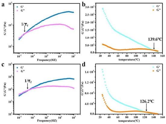 (a) Rheological curves of BDM-1.7 elastomers (90 °C) for deducing relaxation time of chain flow transition τf; (b) Temperature sweep of rheological testing for the BDM-1.7 elastomer; (c) Rheological curves of BDH-1.7, elastomers (90 °C) for deducing relaxation time of chain flow transition τf; (d) Temperature sweep of rheological testing for the BDH-1.7 elastomer.