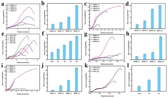 (a) Shear strength-displacement curves of BDM-based elastomer at 80 °C for 8 h; (b) Shear strength of BDM-based elastomers at 80 °C for 8 h; (c) Shear strength-displacement curves of BDM-based elastomer at 150 °C for 0.5 h; (d) Shear strength of BDM-based elastomers at 150 °C for 0.5 h; (e) Shear strength-displacement curve of BDM-2.3 elastomers at 80 °C for 0.5, 2, 4, 6, and 8 h; (f) Shear strength of BDM-2.3 elastomers at 80 °C for 0.5, 2, 4, 6, and 8 h; (g) Shear strength-displacement curves of BDH-based elastomer at 80 °C for 8 h; (h) Shear strength of BDH-based elastomers at 80 °C for 8 h; (i) Shear strength-displacement curves of BDH-based elastomer at 150 °C for 0.5 h; (j) Shear strength of BDH-based elastomers at 150 °C for 0.5 h; (k) Shear strength-displacement curve of BDH-2.0 elastomers at 80 °C for 0.5, 1, and 2 h; (l) Shear strength of BDH-2.0 elastomers at 80 °C for 0.5, 1, and 2 h.