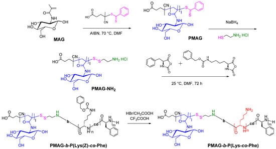 Scheme of synthesis of amphiphilic PMAG-b-P(Lys-co-Phe).