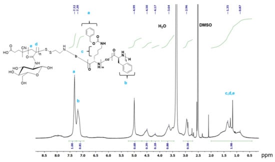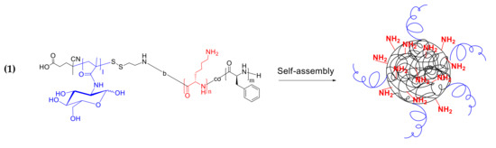 Recently, we have reported the synthesis of biodegradable poly(l-lysine-co-d-phenylalanine) (P(Lys-co-d-Phe)), which was characterized with prolonged stability to enzymatic cleavage due to the presence of d-amino acid [35]. That cationic polymer formed the narrowly sized nanoparticles prospective as drug delivery systems. The main drawbacks of P(Lys-co-d-Phe) NPs were their aggregation in the culture medium and cytotoxicity at concentrations higher than 32 µg/mL. As it has been shown, the mentioned obstacles can be overcome by the covering of P(Lys-co-d-Phe) NPs with heparin [34,35]. Thus, the application of hydrophilic negatively charged or neutral glycopolymer can shield the positive charge of P(Lys-co-Phe) NPs and reduce the cytotoxicity and a rate of uptake by macrophages. In this regard, the synthetic neutral glycopolymer PMAG covalently conjugated with P(Lys-co-Phe) as a hydrophilic block or shell can provide the abovementioned properties as well as improve their stability to enzymatic cleavage and guarantee the stable linkage with P(Lys-co-Phe). In turn, an introduction of the disulfide bond between PMAG and P(Lys-co-Phe) blocks could provide the sensitivity of such systems to glutathione-mediated disruption of the NPs inside a cell.