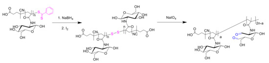 The synthesis of oxidized glycopolymer was carried out using a sample of PMAG containing 22 monomer units (Mn = 10,700, Ð = 1.09). For the preparation of functionalized PMAG, its dithiobenzoate end-group was removed by reduction with NaBH4, followed by dimerization of the polymer in the presence of iodine (Figure 3). Dialdehyde derivatives (ox-PMAG) were then obtained via reaction with IO4− ion as described elsewhere [55]. The oxidation was performed at different molar ratios of NaIO4/MAG units to vary of aldehyde groups content.