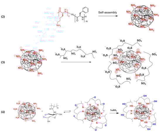 Schematic representation of: (1) PMAG-b-P(Lys-co-Phe) self-assembly; (2) P(Lys-co-Phe) self-assembly; (3) covering of P(Lys-co-d-Phe)-based NPs with heparin; (4) covalent modification of P(Lys-co-dl-Phe)-based NPs with ox-PMAG.