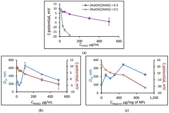 Dependence of (P(Lys-co-dl-Phe)-PMAG) particle ζ-potential on ox-PMAG concentration of different content of aldehyde groups (a) and dependence of P(Lys-co-dl-Phe) and P(Lys-co-d-Phe) particle size and ζ-potential on ox-PMAG (obtained at [NaIO4]/[MAG] = 0.3) (b) and heparin concentration, respectively (c) (0.01 M PBS, рН 7.4, CNPs = 0.1 mg/mL).