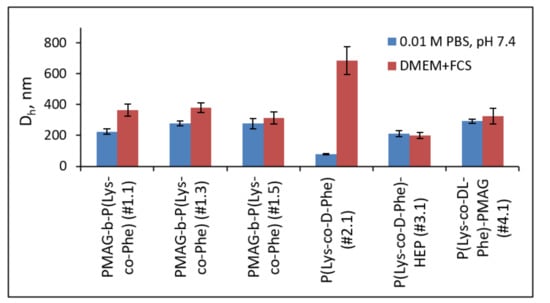 In our previous study, to obtain nanomaterials with improved stability, random copolymers based on α-d-amino acids [35] or hybrid block-copolymers, consisting of hydrophilic non-degradable glycopolymer, namely poly(2-deoxy-2-methacrylamido-d-glucose) (PMAG) and polyleucine or polyphenylalanine (PPhe) [53,54], were synthesized and used for preparation of polymer particles. It was found that d-amino acid and PMAG-containing nanoparticles proved to be more stable against enzymatic degradation than those based only on poly(l-amino acids). Moreover, PMAG-based polymer particles did not induce cell death in a wide range of concentrations and possessed glutathione-mediated particles’ disruption that could vary depending on hydrophilic block length [54].