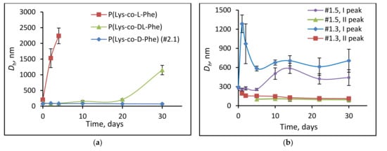 Changes in hydrodynamic diameters of NPs over time (DLS): (a) P(Lys-co-Phe) and (b) PMAG-b-P(Lys-co-Phe) NPs. Conditions of biodegradation: 0.01 M PBS, pH 7.4, T = 37 °C, CNPs = 1.0 mg/mL; Cpapain = 0.5 mg/mL. The compositions of different polymer samples are provided in Table 2.