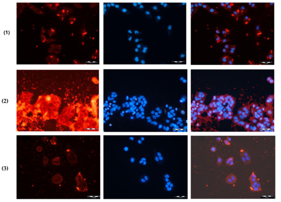 A qualitative study of the penetration of nanoparticles into cells was performed using fluorescence microscopy. 4 × 104 cells in 200 μL of DMEM were seeded on glass chamber slides (LabTec-II with CC2 treatment) and cultured for 24 h. The medium was then changed with a fresh one, containing fluorescently labeled particles at a concentration of 60 µg/mL. Cells were incubated for 4 h at 37 °C. Thereafter the medium was removed, and cells were washed three times with warm 0.01 M PBS, pH 7.4, and detected under fluorescence microscope (Olympus IX50) equipped with an Olympus camera (SC30, Tokyo, Japan) and Cell Sens Standard software, using excitation, and barrier filters were BP 530–550 and BA 590, respectively.